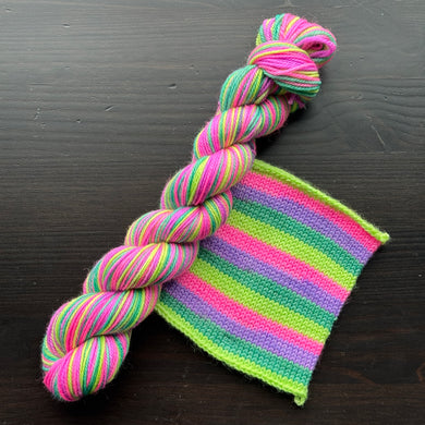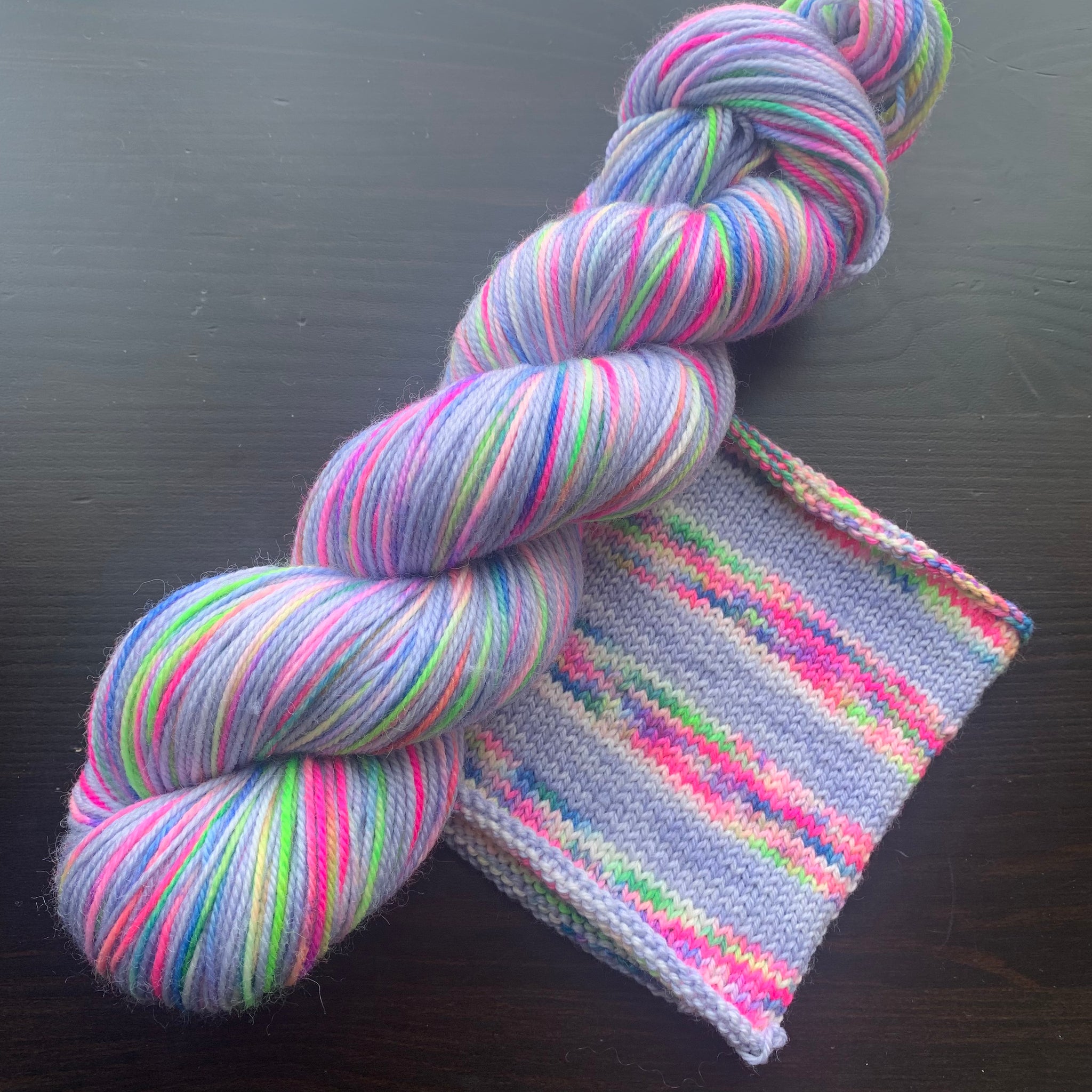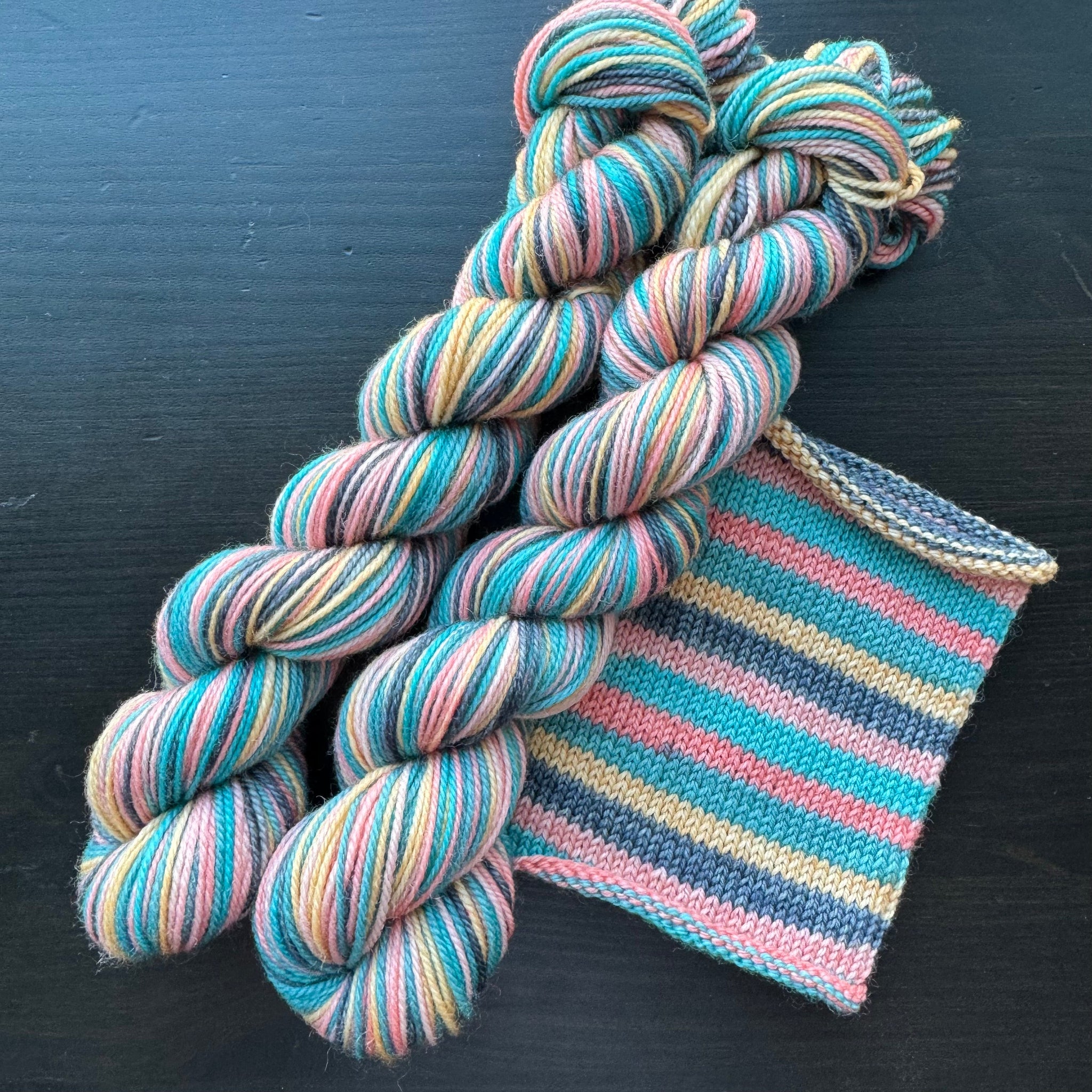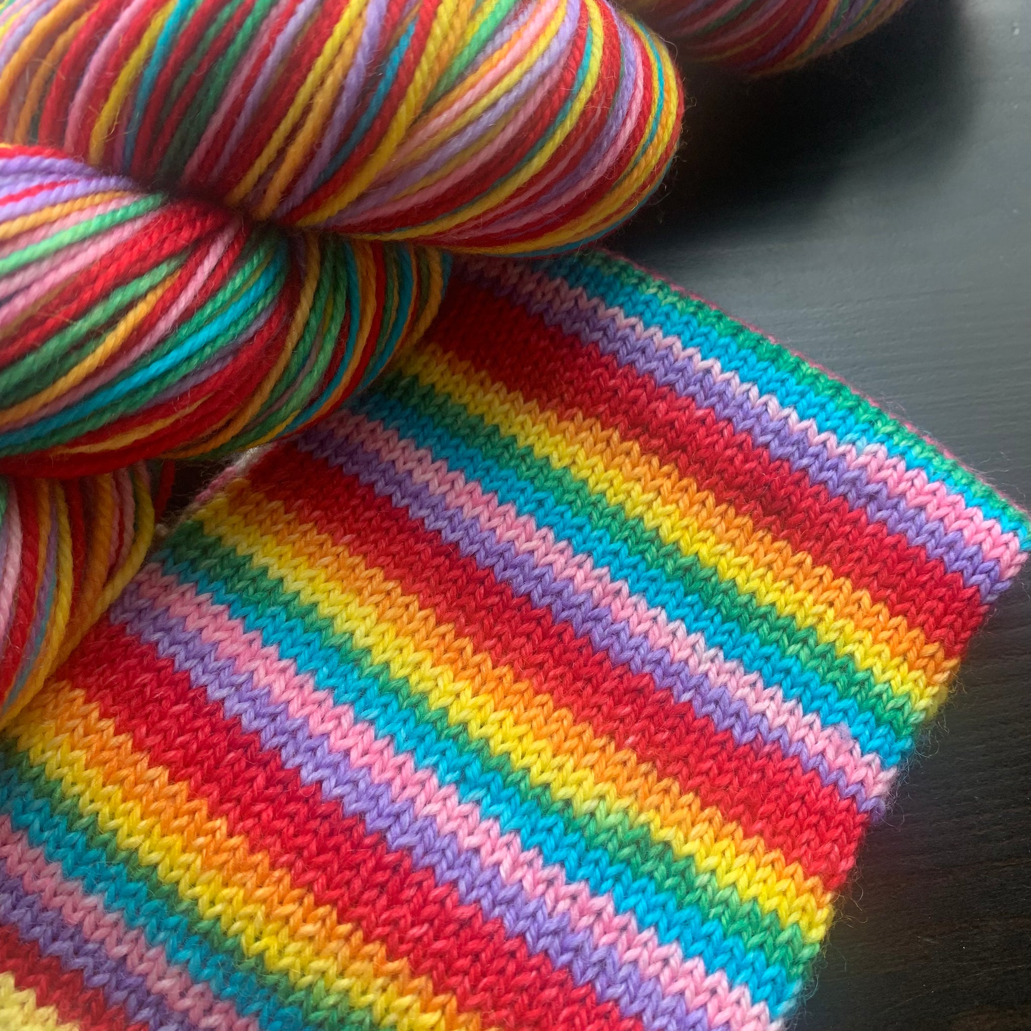 I am an indie yarn dyer, based out of Alberta, Canada, specializing in self striping yarn! So, most of what you will find on my website is, you guessed it, self striping yarn. I offer full skeins and half skeins, along with the occasional sock set.