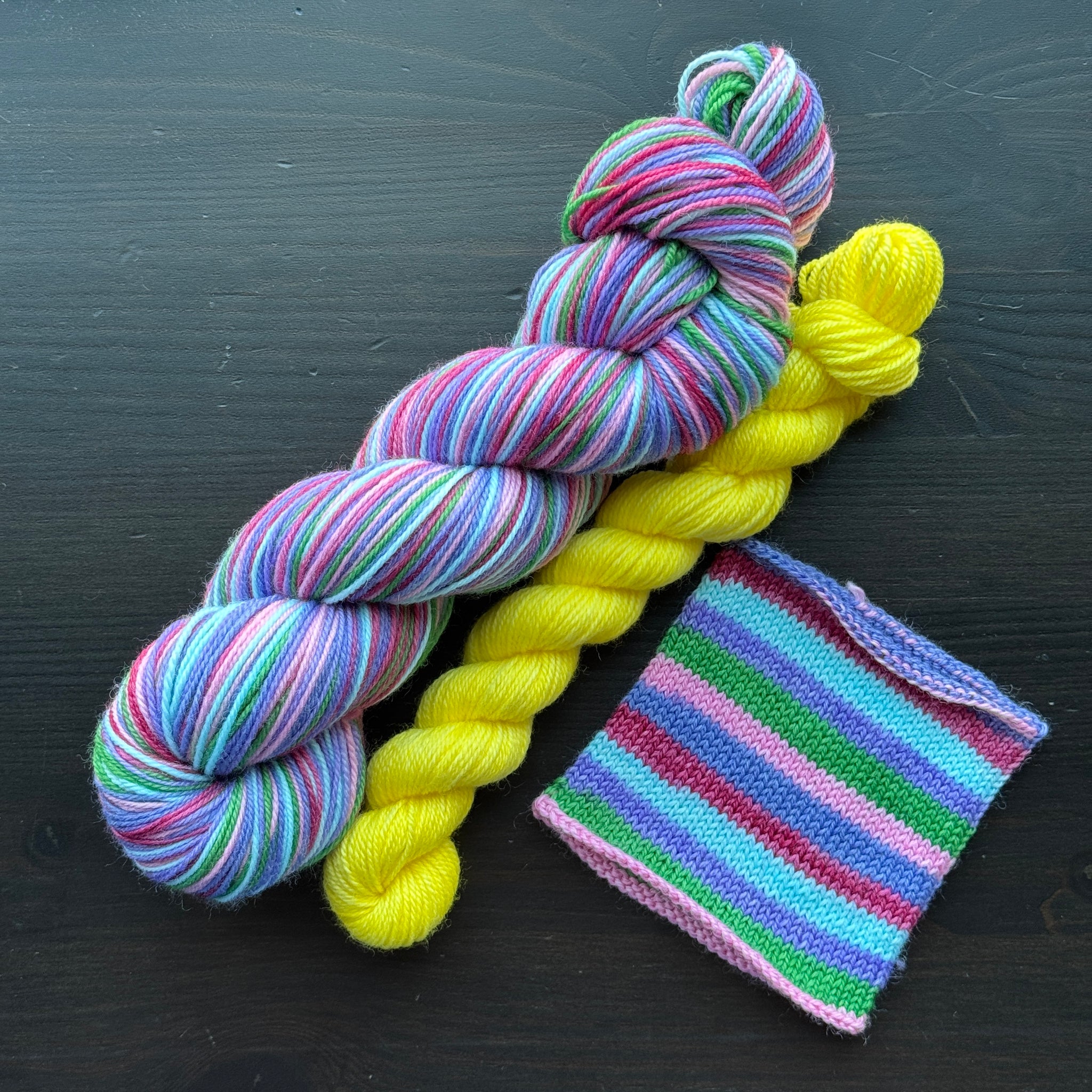 EMBRACING THE CHAOS is a six stripe colourway - light blue, purple, green, pink, bluish-purple and reddish-pink. This set comes with a yellow mini skein.