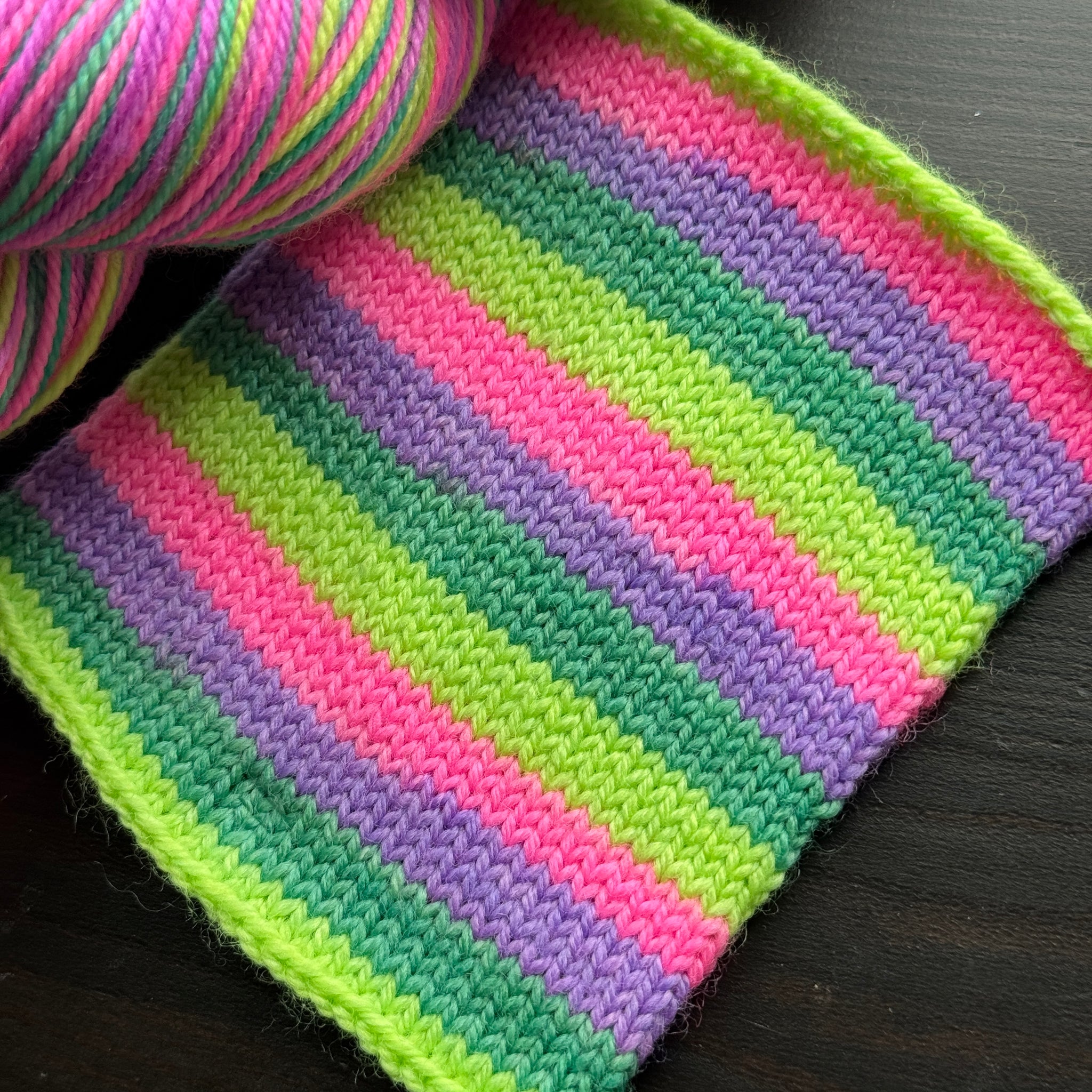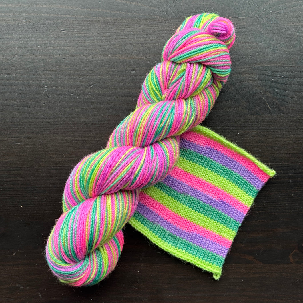GARDEN PARTY is a self striping colourway that has four stripes per repeat - green, bright yellow-green, bright pink, and purple.