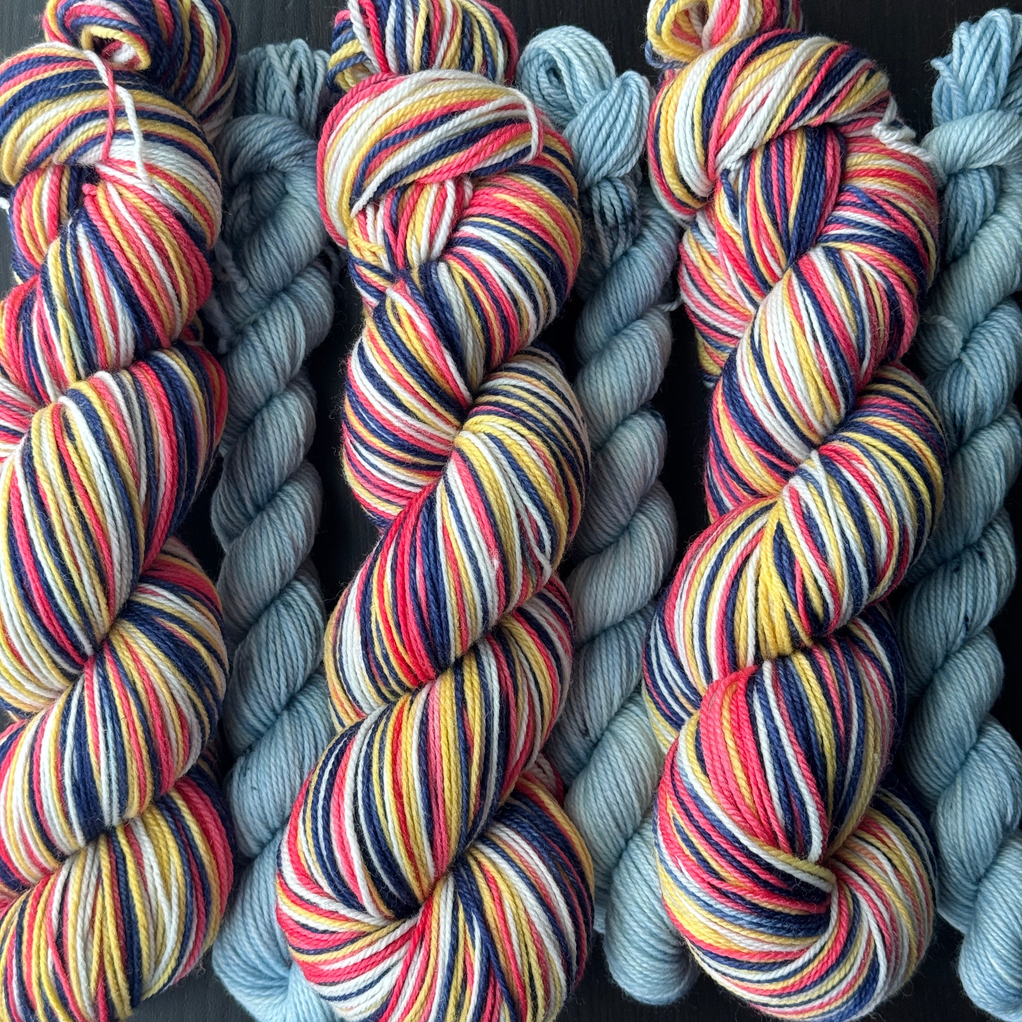 GO, SPORTS! is a self striping colourway with a four stripe repeat - navy blue, light gray, red and gold. Paired with a speckled blue mini skein. This set has a total of 511 yards.