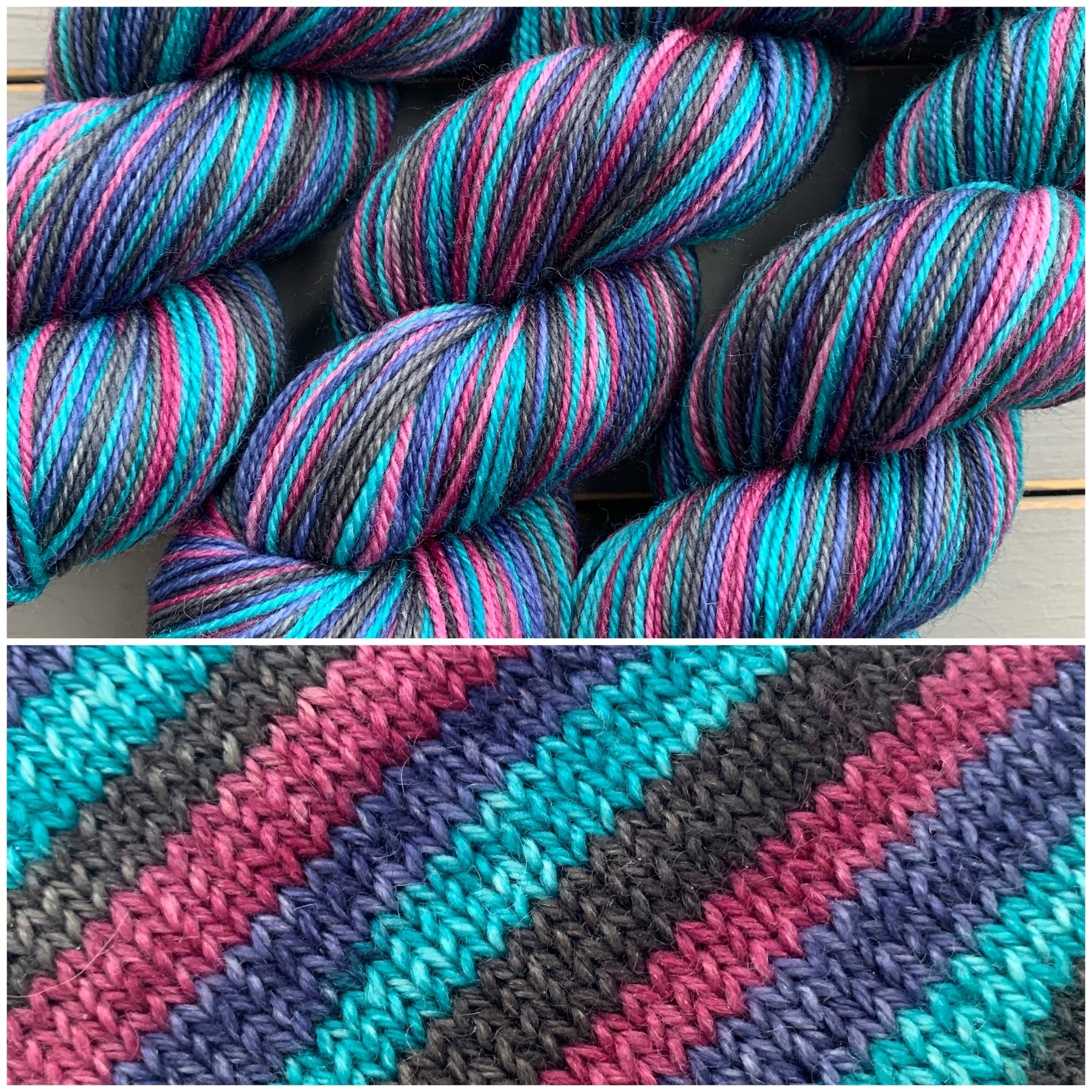 TREASURED is a self striping colourway that has four colours per stripe repeat - navy blue, burgundy, black and teal.