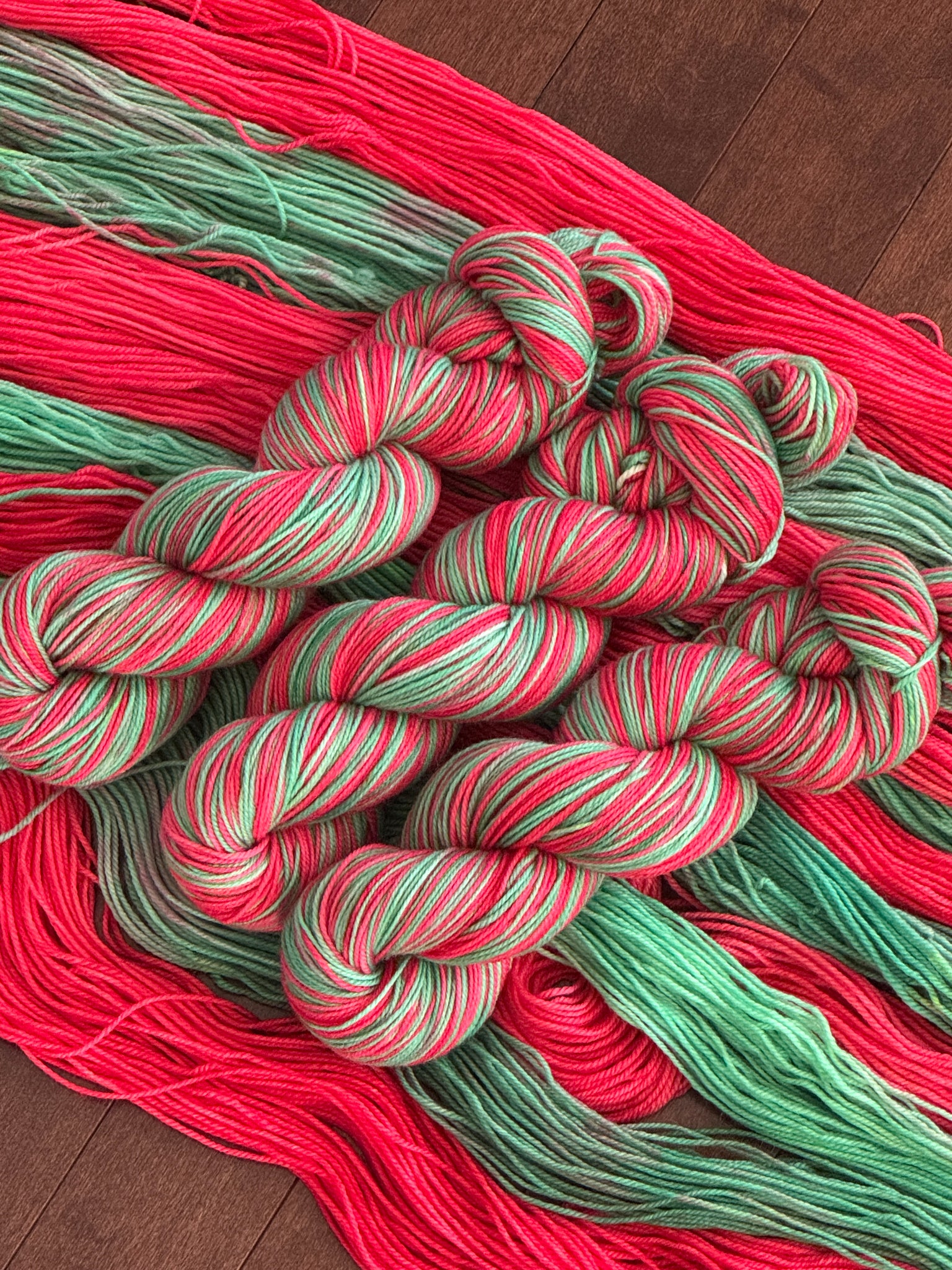 WILD ONE #161 is a self striping colourway that has two colours per stripe repeat - red and a green with subtle bits of pink and light green throughout.