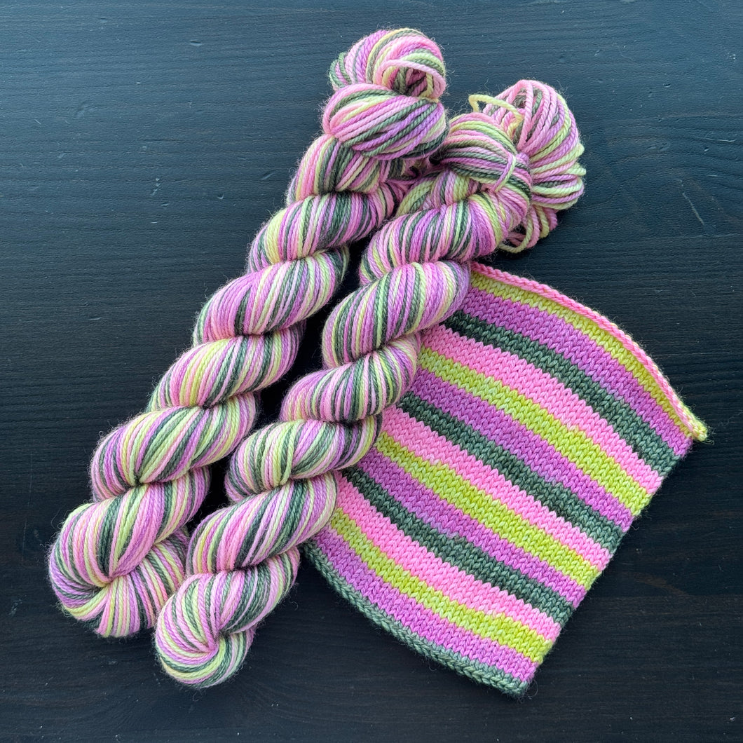 CHRISTMAS WITH BARBIE is a self striping colourway that has four colours per stripe repeat - purple, chartreuse, hot pink and green.